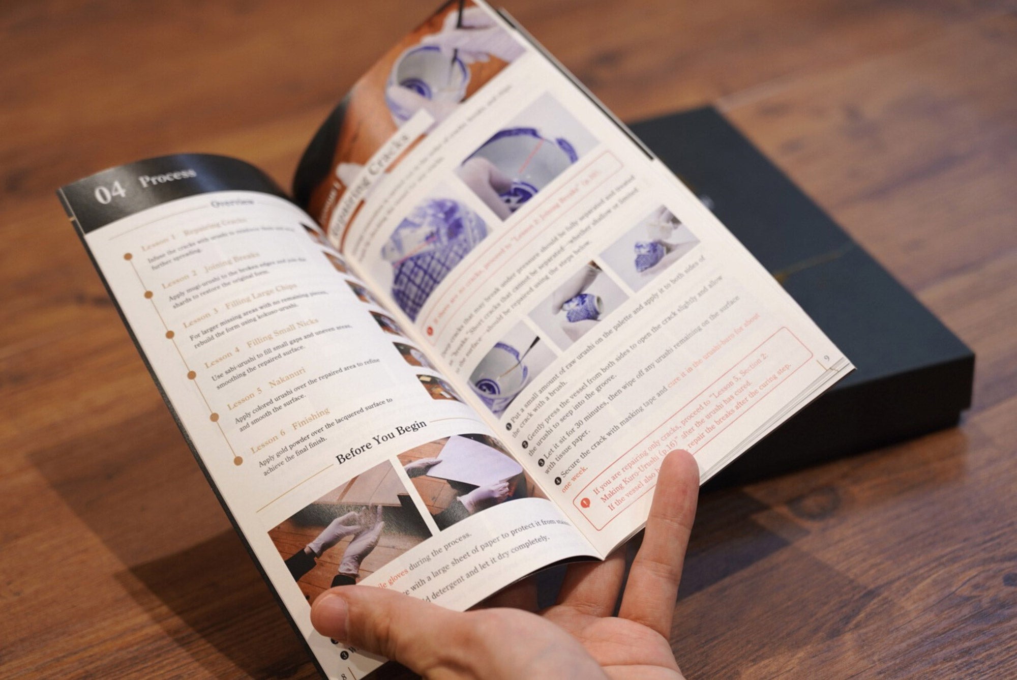 キットには金継ぎの手順を図説したガイドブックが付属しています。日本語と英語に対応しており、初心者でも伝統的な金継ぎの技法を簡単かつ分かりやすく習得できます。