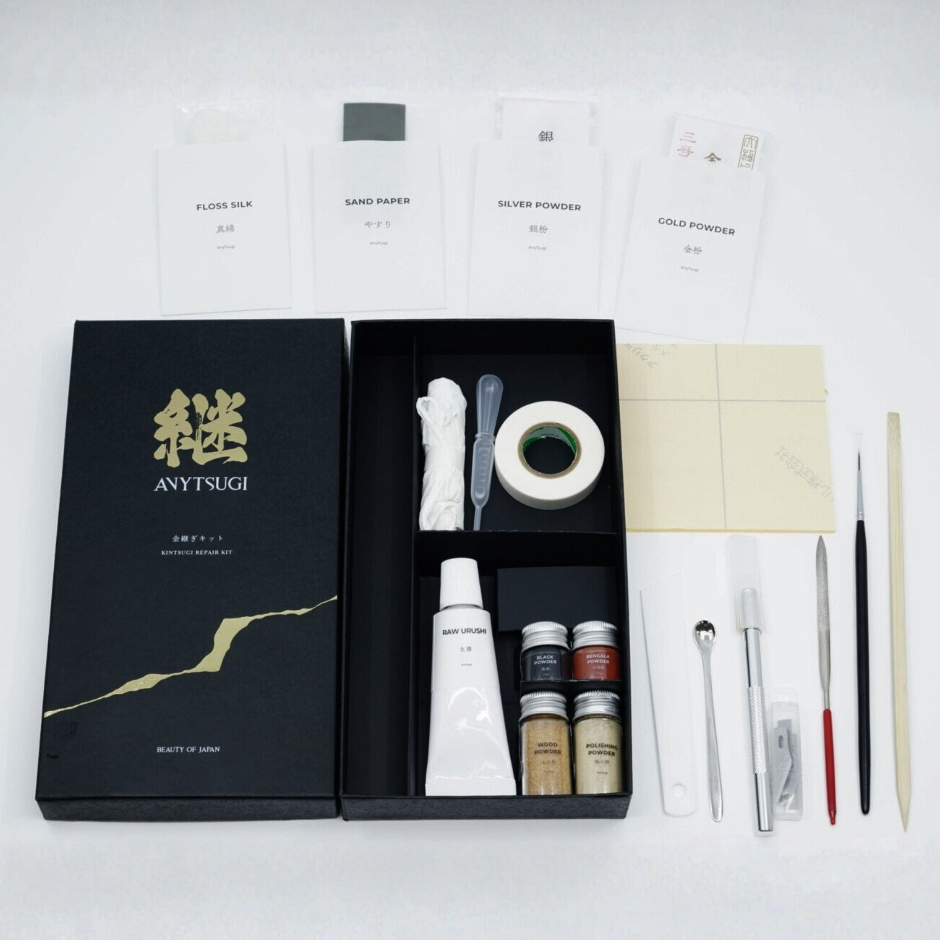キットにはプロ仕様の道具がすべて揃っているので、自宅で本格的な金継ぎを練習できます。これらの道具は、壊れた作品を自分で修理する際にも再利用できます。