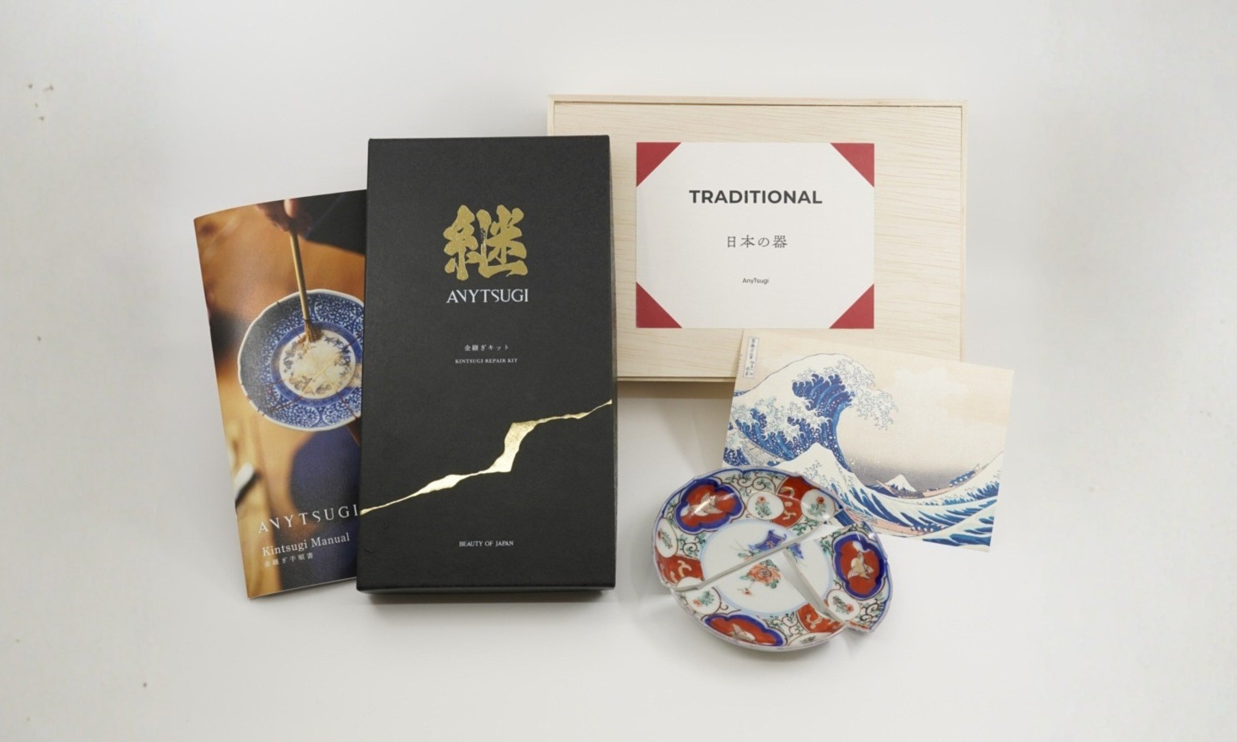 本商品には、金粉と銀粉(各0.1g)を含む金継ぎ修復材料一式、初心者向けの手順書が含まれおり、100年以上前の日本の骨董皿がセットになっています。天然の漆を用いた伝統的な金継ぎ手法を使用するため、修復された器は日常使いにおいて食器として安全にご使用いただけます。